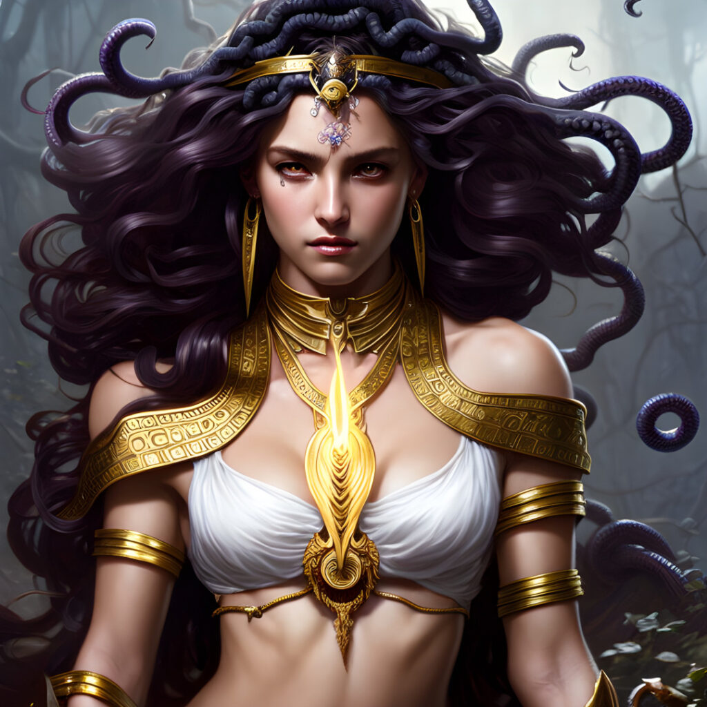 Medusa is a character from Greek mythology, known for her appearance as a woman with snakes for hair and the ability to turn people to stone with her gaze. According to the myth, Medusa was once a beautiful woman and a priestess of Athena, but she was cursed by the goddess after she caught Poseidon, god of the sea, raping her in Athena’s temple. Athena punished Medusa by turning her hair into snakes and making her so hideous that anyone who looked upon her face would be turned to stone.Medusa is often depicted as a monster and a villain in Greek mythology, but some interpretations suggest that she was actually a victim of the gods’ cruelty. In some versions of the myth, Medusa’s curse is seen as a punishment for her own pride and vanity, while in others she is seen as an innocent victim of Poseidon’s lust and Athena’s wrath.