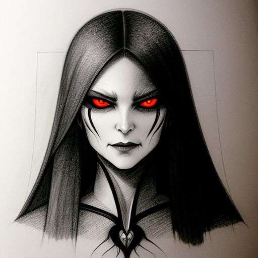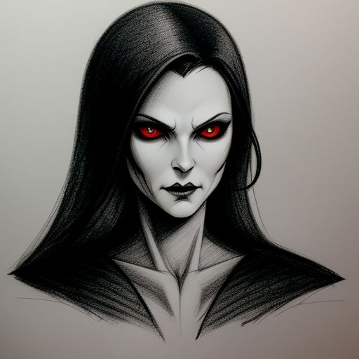 A cold and imposing vampire figure whose presence feels both mournful and menacing. Her crimson eyes glow like embers in the dark, hinting at ancient grief entwined with predatory hunger. Long dark hair frames her pale, statuesque face, giving her the aura of a widow who has outlived centuries—and perhaps caused a few endings herself.