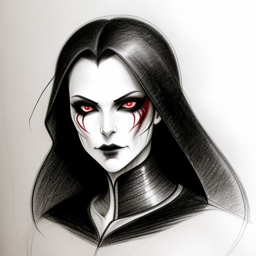 A regal and enigmatic vampire sovereign adorned in an aura of absolute authority. Her blood-red eyes burn beneath a curtain of jet-black hair, revealing a ruler untouched by time. The sharp contrast between her pale face and dark silhouette gives her a ghostly majesty—an empress who commands fear, devotion, and the eternal night itself.