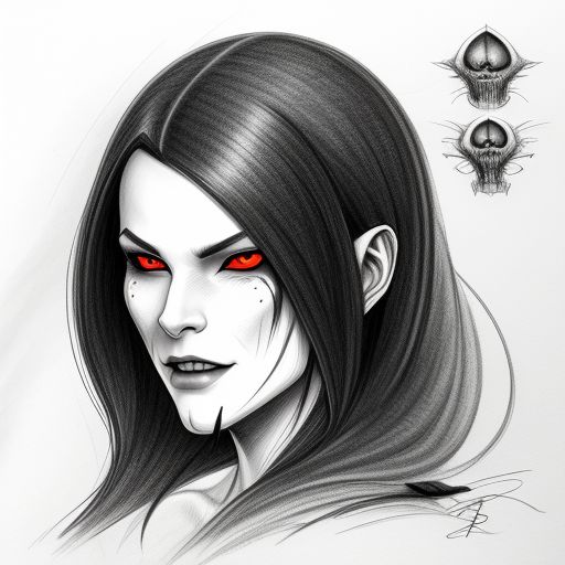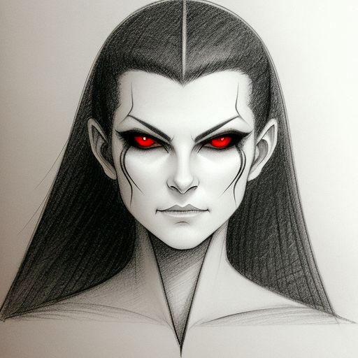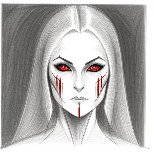 A haunting avatar whose glowing crimson irises flare like portals to a malevolent dimension. Her stark black-and-white features make the red even more intense, giving her an abyssal, almost demonic allure. Her expression is unwavering and fierce, suggesting she is both the watcher and the danger lurking within the void.
